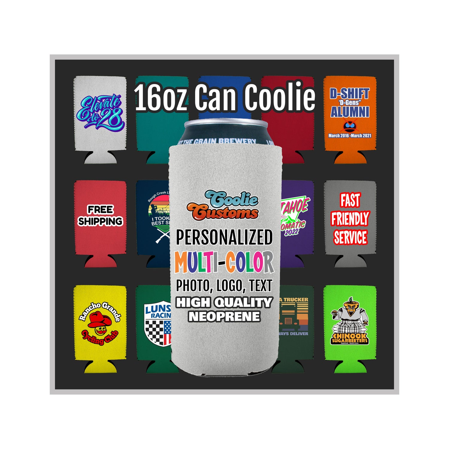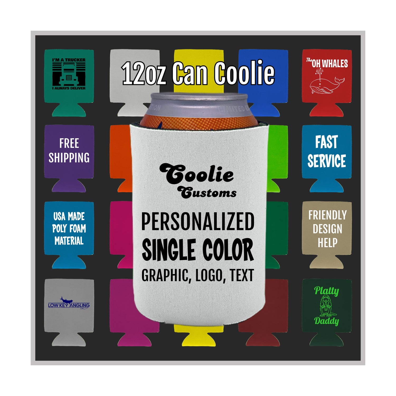 Get a sweet deal on customized beer Koozie® and can coolers with FREE standard shipping! Our graphic designers will assist you with your artwork for free, or use our design tool to create your own masterpiece. You’ll also receive a free email proof of your design for approval with the chance to make changes prior to production. We have one of the widest selections in the industry featuring standard can, beer bottle, pint glass, solo cup, slim can, 16oz can, 24/25oz can, thick neoprene can, thick foam "old school" can coolies and Koozie® can coolers and more. We also feature no minimum order size on many popular items, you're sure to find something that fits at Coolie Customs. You can also get your coolies or Koozie® can coolers delivered quickly with our rush production and shipping options. Reusable foam or neoprene coolies and Koozie® can coolers are great party favors for weddings, bithdays, bachelor and bachelorette parties, holidays, events, vacations and other occasions.